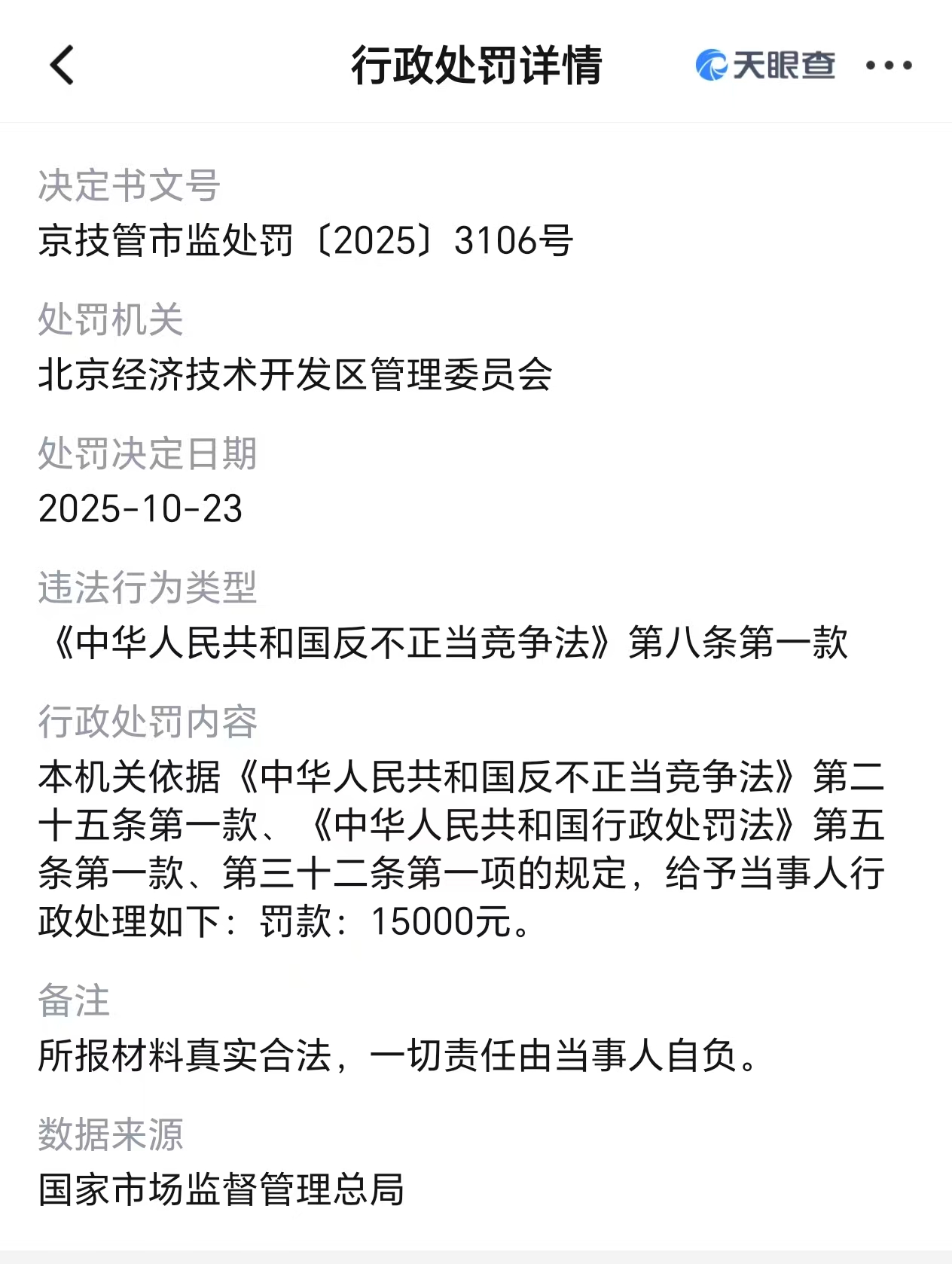 10月30日消息,天眼查APP显示,近日,北京二锅头酒业股份有限公司(北京二锅头)因违反反不正当竞争法,被北京经济技术开发区管理委员会罚款1.5万元。